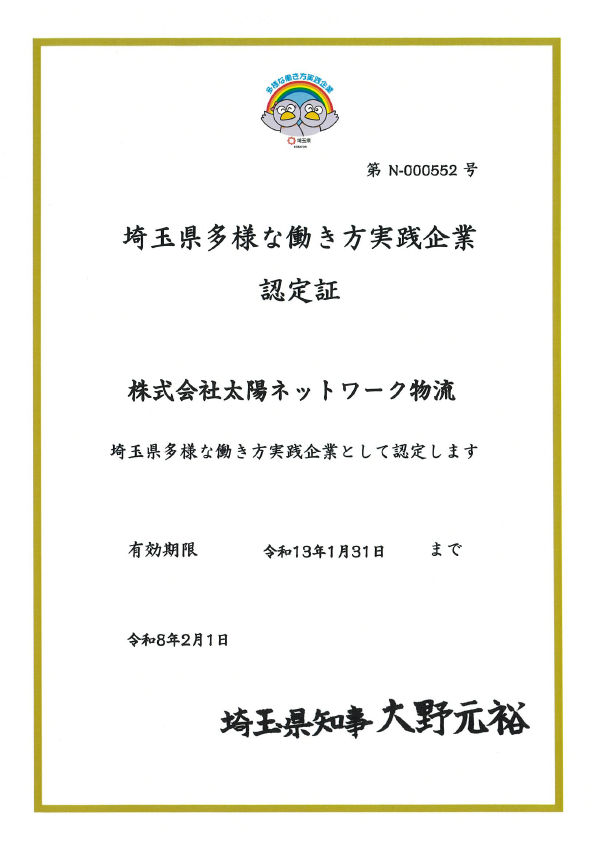 飯能DC事業所は、2022年4月1日に埼玉県『多様な働き方実践企業』の『プラチナ認定』を受けています。