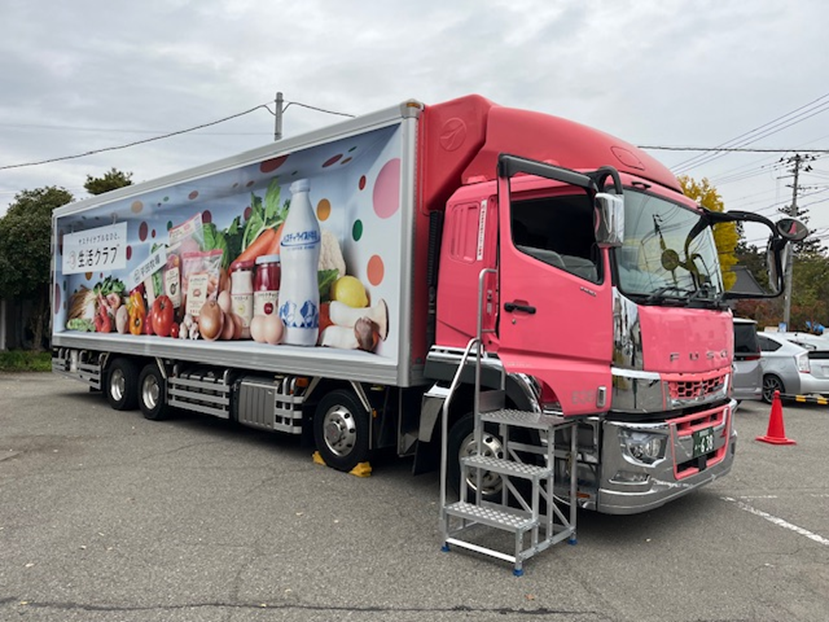 太陽ネットワーク物流は、福島県のセンターに配送を行っていることから、イベント企画として大型トラックの展示、乗車体験を行いました。