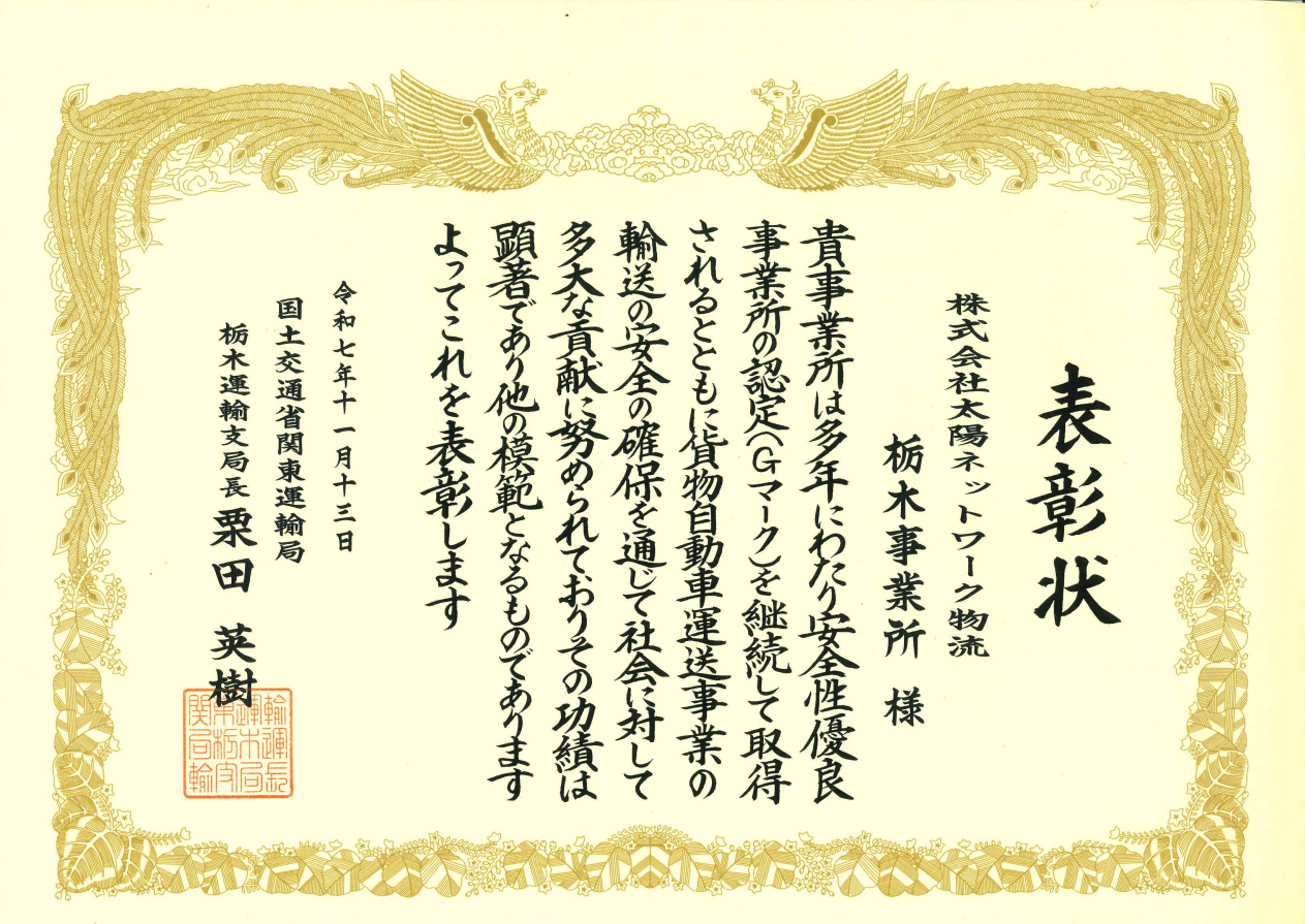 このたび、栃木事業所は「Gマーク(安全性優良事務所)認定」を10年以上連続して取得している事業所として表彰されました。